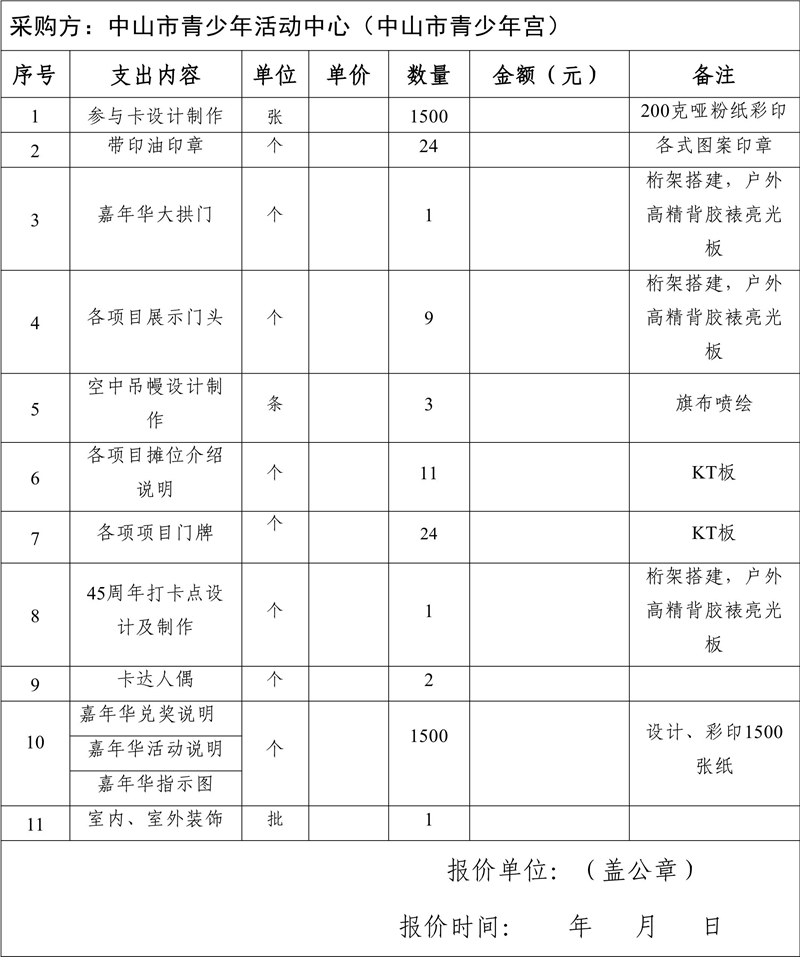 中山市青少年庆祝“六一”暨中山市青少年活动中心(青少年宫)成立45周年嘉年华活动广告设计机构服务项目报价单